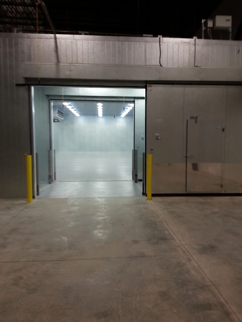 Description: 40' x 60' x 20' rectangular indoor walk-in freezer complete with under floor freezer prevention system, two man doors and one 96" x 96" horizontal electric sliding doors designed and constructed by Chinook Refrigeration, Inc.
